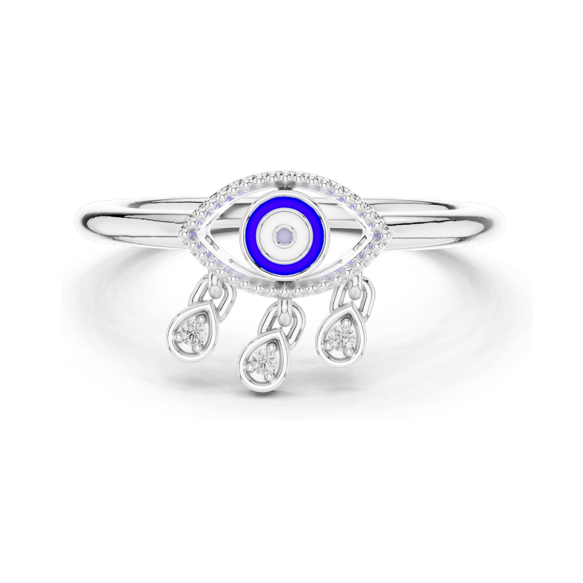 Embrace protection and elegance with this beautiful 0.024 Carat Evil Eye Ring for women. The central evil eye motif is highlighted by a vibrant blue enamel center, surrounded by round brilliant-cut lab-grown diamonds (VVS-VS clarity, EF color, CVD-grown), which add sparkle and sophistication. The unique design features delicate diamond-accented drops beneath the eye, creating a modern and stylish look with symbolic significance.