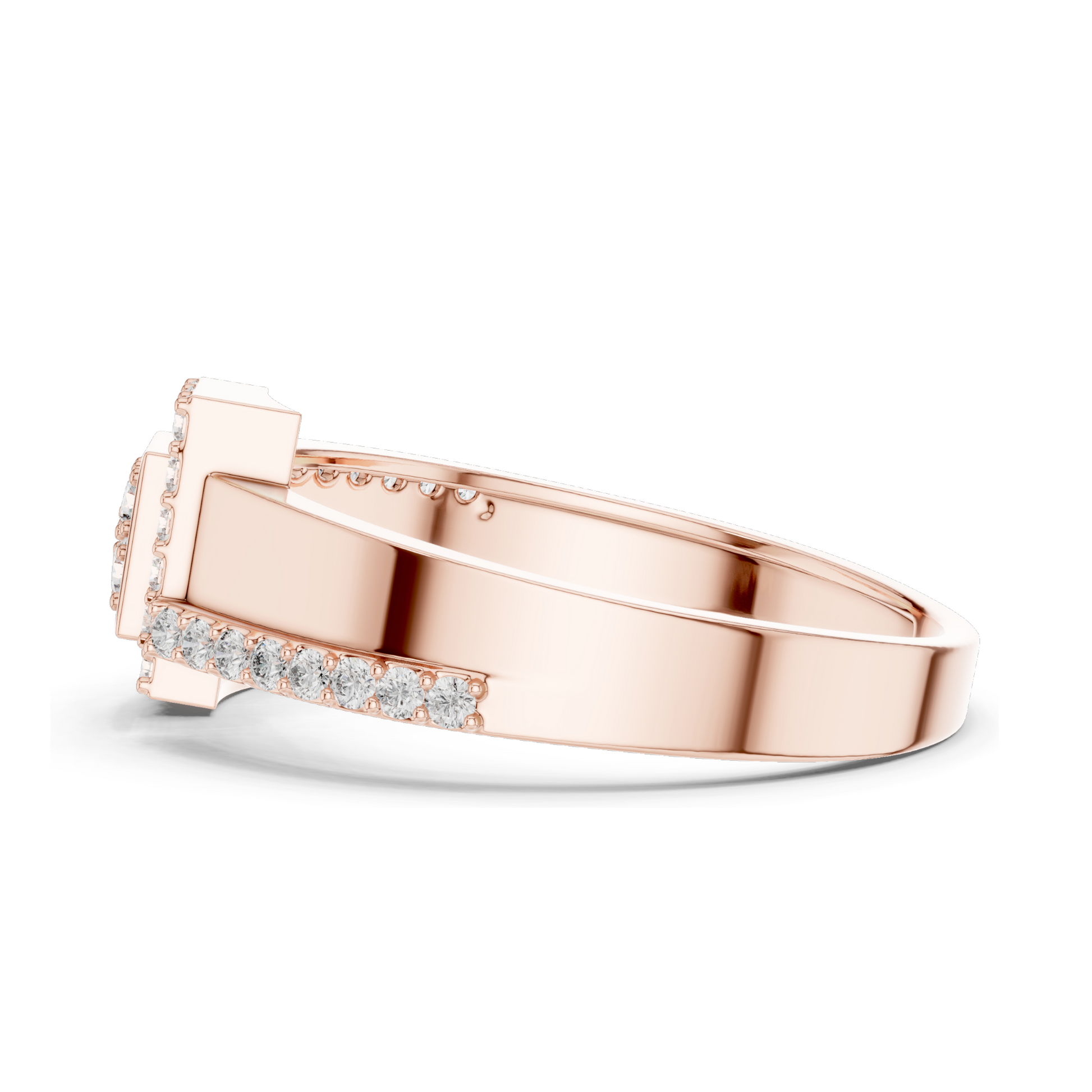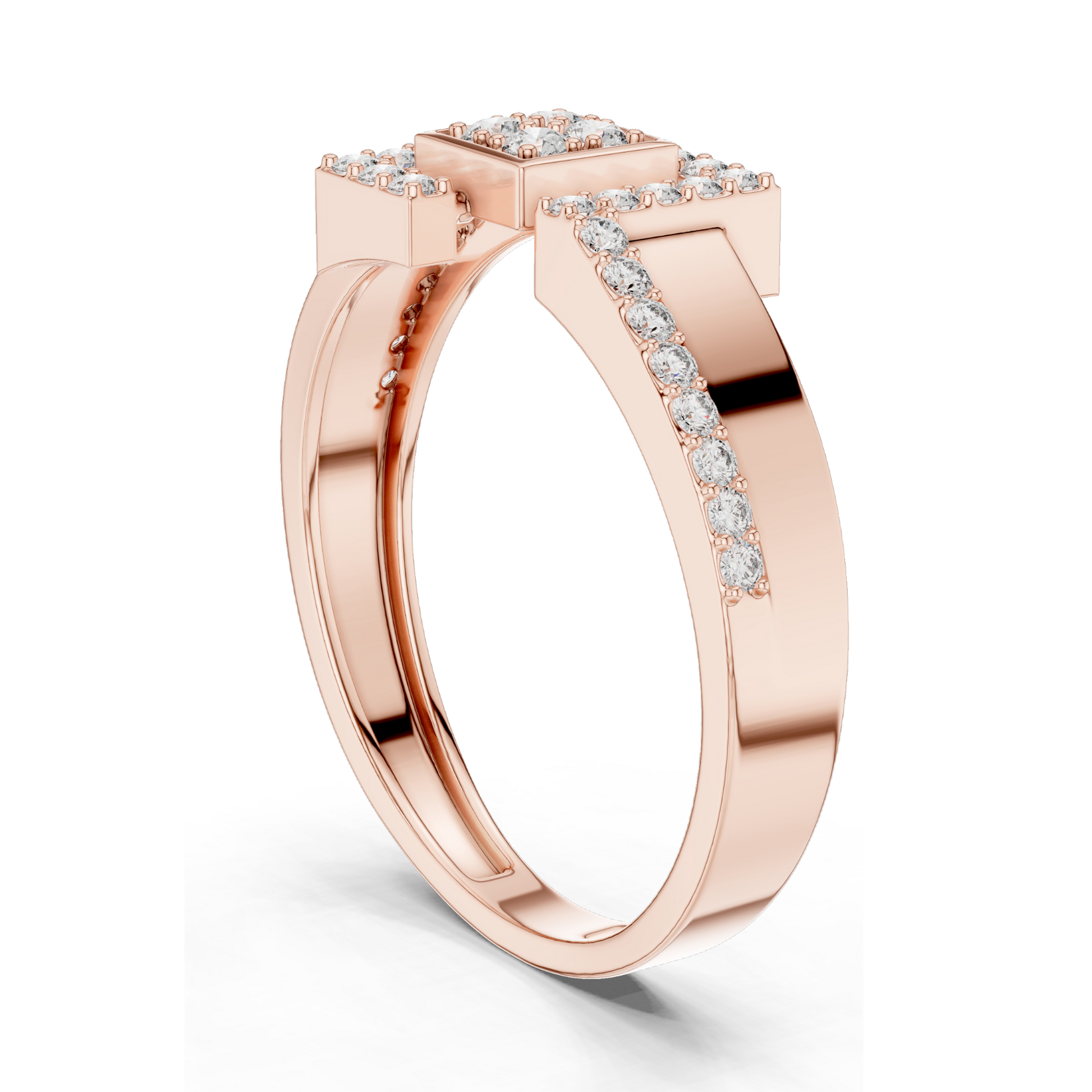 Crafted with care and precision, the design incorporates a geometric arrangement of square cluster diamonds that exude sophistication and charm. The band is adorned with diamonds, extending from the center to the shoulders for a luxurious, full-diamond look. This ring is available in a variety of metals, including 18KT, 14KT, 10KT gold, and 925 sterling silver, with options for rose, yellow, or white gold finishes. Additionally, Moissanite stones can be chosen for an equally dazzling effect.